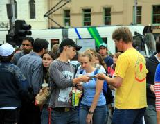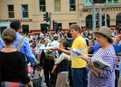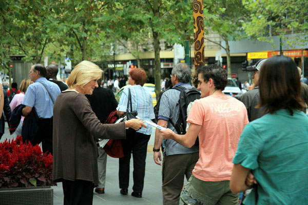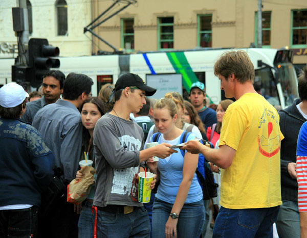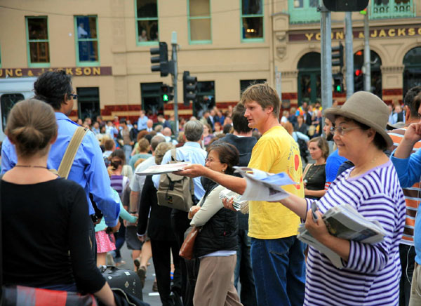 ![]() 在墨尔本市中央火车总站前派发资料 | ![]() 在墨尔本市中央火车总站前派发资料 |