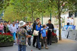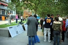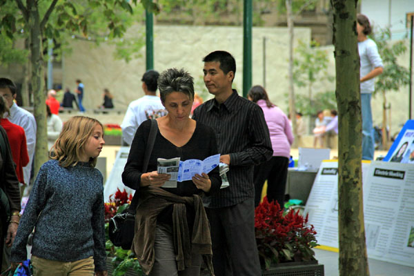 ![]() 市中心广场洪法点上的功法演示 | ![]() 游客们观看展板,了解真相 |