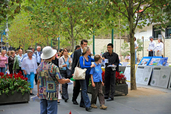 3月15日是英联邦运动会开幕式,法轮功学员们从早上10点起至晚上9点,在墨尔本市中心的中央火车总站前和市广场等主要的街口上派发真相资料,在洪法点上摆放展板等。