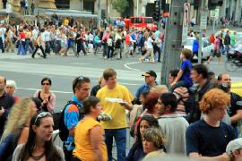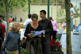 ![]() 一名女士接过传单后边走边看 | ![]() 游客在中央火车总站前观看展板 |