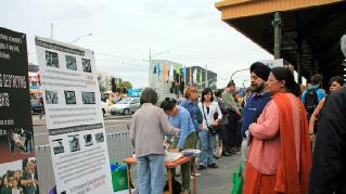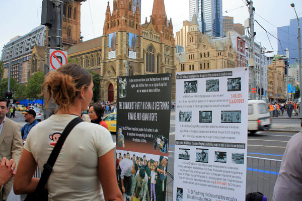 ![]() 游客在中央火车总站前观看展板 | ![]() 在墨尔本市中央火车总站前派发资料 |