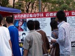 3位从嘉义北上到淡水念书的大学生,看到法轮功学员受迫害的展板,就主动过来签名,当更进一步知道“活体摘除器官”的迫害情况,他们一致的表示“太恐怖了”。其中一位学生在了解的过程中一直眉头紧皱着。
