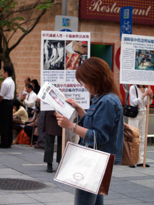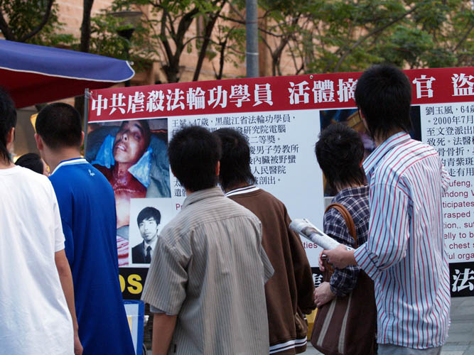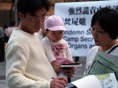 一位年轻的小姐表示,看到这样杀活人盗卖器官的黑心作法实在令人心寒,尤其看到这些活生生被掏空器官后焚尸灭迹的法轮功学员,虽然不认识他们,还是觉的非常心痛。她说每年台湾都有很多人到大陆换器官,她建议学员们一定要在媒体曝光,让更多的民众知道,同时也要让政府高层知道中国人体器官买卖市场背后的谋杀。最后她多要了一些报导此事件的真相材料,她说她有很多朋友在中国大陆工作,她一定要告诉他们。