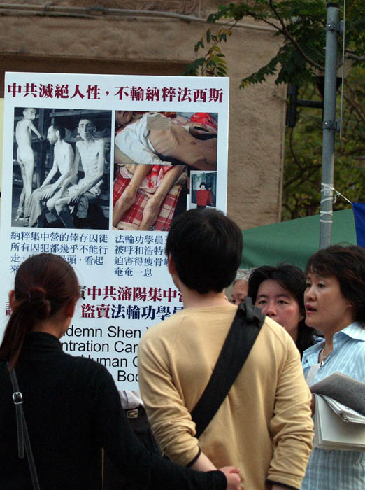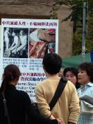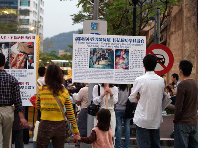 周末的午后,在素有“台北曼哈顿”之称的台北东区购物商圈世贸展览二馆,紧临世界最高楼--台北101大楼附近游人如织,是人潮最多、最热闹的地方。一幅控诉“中共虐杀法轮功学员,活体摘除器官,盗卖发黑财”,“SOS抢救沈阳杀人集中营6000名法轮功学员”的巨大的展板和“强烈谴责中共沈阳集中营设焚尸炉盗卖法轮功学员器官”的白底黑字大横幅,这个石破天惊的讯息,震惊了过往的民众。