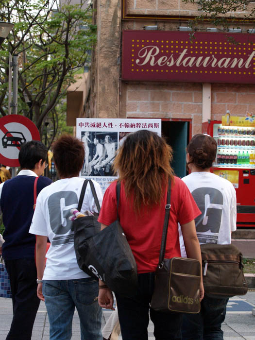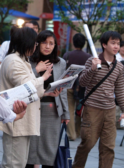 三位年轻的朋友听着法轮功学员讲述苏家屯事件时表示,他们本就讨厌中共,现在看到他们如此残忍,还活摘人体器官,希望中共能赶快瓦解,正当说时,一个民众跑了过来,他说“这是真的,他们说的都是真的”。他本身是浙江人,家族都受到中共的迫害,今天很高兴,很感动法轮功学员能将这事公布出来,让全世界的人都知道中共的残忍与不人道。