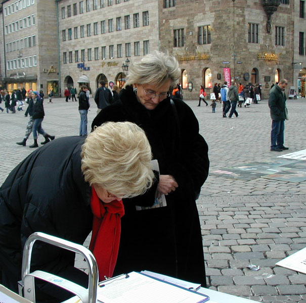 70多岁的安娜马琳·蒙克女士签名制止中共的野蛮行径,她表示,很多德国人很乐意致力于让中国人民在各方面享有自由,不论是政治上还是宗教信仰上的。在欧洲很多国家都信奉上帝,但很重要的一点是,无论什么信仰,我们都很尊重,人类应该享有自由和尊严。她接着说:“我的父母曾经在反希特勒的组织里工作,小时候我也曾帮了不少忙,纳粹时代发生的事情太恐怖,6百万犹太人被关押在集中营并被有计划的屠杀,在未来的1000年中,这都可作为人类历史上的灾难被记载,这种犯罪行为必须严肃处理。”