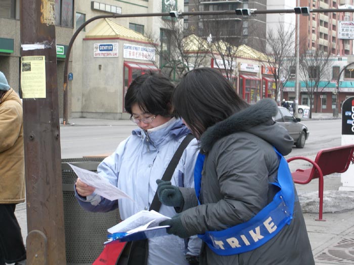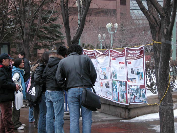 学员们刚刚在唐人街挂好横幅就过来一位大妈问发生了什么事情, 一位学员指着横幅标语告诉她沈阳苏家屯发生了令人发指的杀人惨案,大批法轮功学员被虐杀,他们的器官被摘除。“哎呀,妈唉,苏家屯离我们那旮达不远,怎么能有这种事呢?”那位学员说:“共产党什么事干不出来,这么多政治运动,您肯定经历了不少。” “嗨,我们家就有人被抓,被杀呢!”大妈话音刚落,这位同修就想起了很多次的讲真相活动,几乎每次都能碰到愤愤不平的人们拉着法轮功学员倾诉他们遭受的迫害,对中共暴政的痛恨。另一位老太太看了展板后主动要了许多传单,说要告诉其他的人,替学员们把传单发给那些还不知情的人。