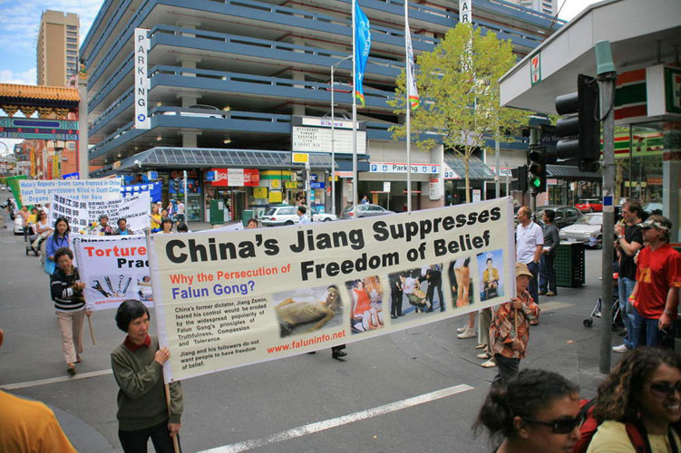 来自五大洲七十二个国家,约三百万民众莅临墨尔本观看比赛。3月18日,法轮功学员在市中心举行盛大游行活动。当天,在墨尔本街头,人头攒动,热闹非凡,众多艺术家展示着精彩纷呈的表演节目。整座城市沉浸在喧哗欢闹之中。伴随着整齐威仪的法鼓声和“法轮大法好”的音乐声,警车开道,由近百位法轮功学员组成的法轮大法游行队伍从街心走了过来。整座城市仿佛霎时间安静下来,人们停止喧哗,屏息注视这一支非凡的游行队伍。