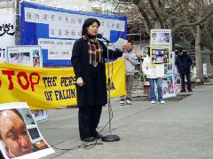 集会上,退!党!服务中心朱利亚女士发言强烈谴责中共的法西斯暴行,并呼吁国际社会立即调查、制止虐杀,并紧急营救正在中国遭受迫害的法轮功学员,帮助制止迫害法轮功。