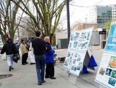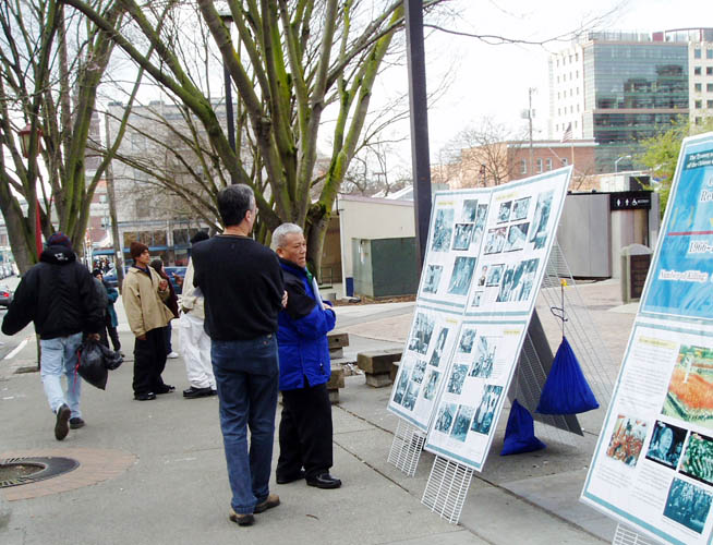 一位过路的美国女士在真相展板旁放下一朵鲜花,以悼念遭中共迫害致死的法轮功学员。另一位中国女士看过真相展板后,询问她能做什么来帮助法轮功学员,学员请她把这个苏家屯集中营的消息告知她在中国的亲朋好友,并劝他们快退出共产党。这位中国女士听后点头认同。