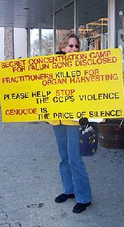 ![]() 金娜德手持展板在寒风中。展板写着:秘密集中营曝光,法轮功学员遭摘取器官后被杀,请帮助制止中共的暴行,沉默的代价是大屠杀。 |
