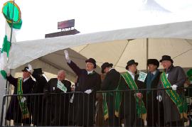 ![]() 观礼台上蒙城市长等人向法轮功学员队伍挥手致意 |