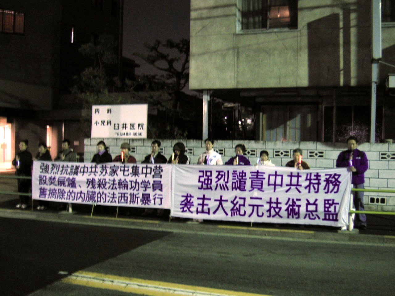 春寒料峭,法轮功学员举着横幅,手持萤光棒,直到深夜。