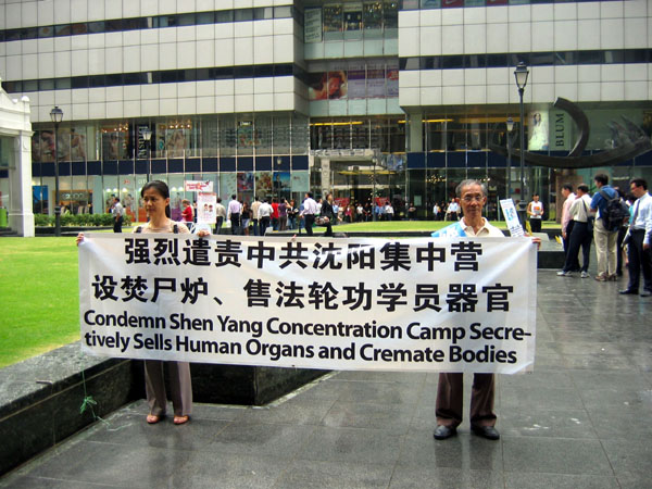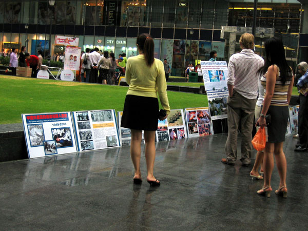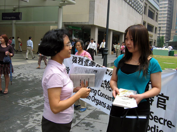 卓雪雯和李爱芬是两位中四生,目前正在等待升学。今天结伴出来闲逛,无意中看到了这些残忍的迫害图片,她俩说言语难以表达心中的感受,希望知道自己能做些什么。雪雯说这些事发生在今天,发生在我们身边,她无论如何都不能接受,她希望那些去中国投资的商人不要只是想着赚钱,要考虑那里正在发生的人权迫害。爱芬说“从这些展示的事实看,苏家屯活体窃取器官焚尸灭迹的事已经存在好几年了,我经常看报,为什么一点都不知道?”爱芬说媒体应该披露真相,她知道不少新加坡人去中国换肾,说他们如果知道“供体”的来源,相信其中很多人不会这样做。