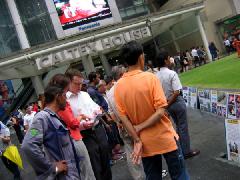 有两位干部模样的中年人昨天在展板前驻足观看了很长一段时间,听口音知道他们来自中国河北省。他们问记者退!党!到底是怎么一回事:“这里说三:退.人数已达九百万,但在国内可一点都没听说,这到底是咋回事儿?”记者回答说:“你从没听说·九·评*退!党!,可你去年一定参加过保先吧?”,“对,没错。保持先進性,加强对三个代表的认识。”记者说:“那是他们的谎言,保先是中共对大.纪.元;发表·九·评*和由此引发的退!党!大潮的回应,它们实在想不出任何其他的办法。中宣部想批·九·评*,但找不到写作班子;中组部想减缓党员退!党!,但不敢直说”。两位干部说这些情况他们的确不知道,但想想他们对六四真相的掩盖以及这个党历史上的所作所为,“相信他们做的出来”。
