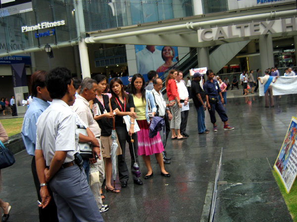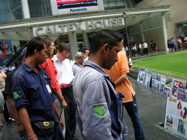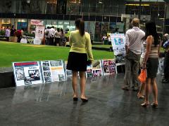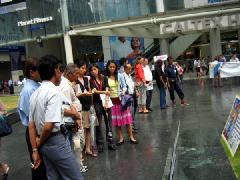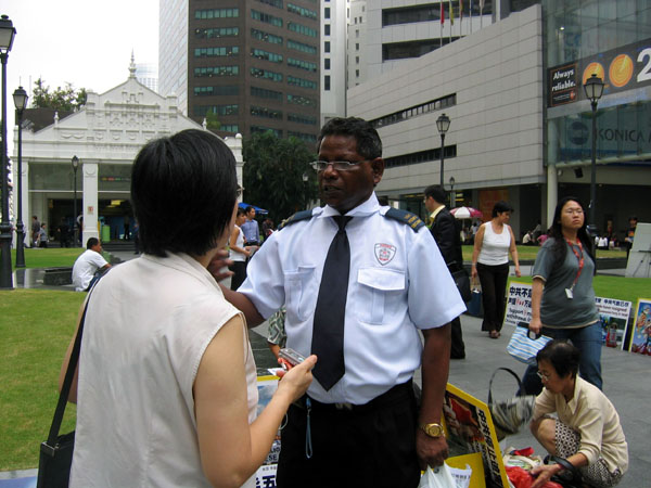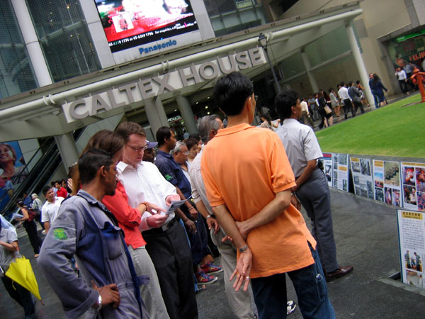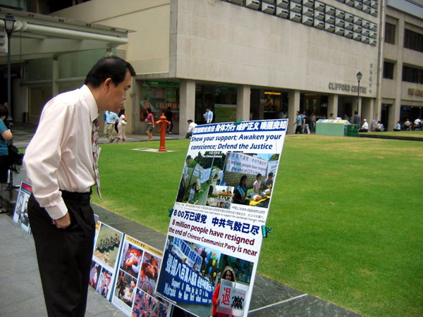 Raffles Place 是新加坡的金融中心,周围高楼林立,除本地的银行证券业外,许多跨国公司也都在此设有办事处,过往行人中很多都涉及与中国相关的业务和投资。昨天中午他们都停下匆忙的脚步,认真阅读展板内容,无不愕然和震惊,很多人主动向学员了解進一步的情况,索取更多的资料包括《·九·评*共产党》的书籍和光碟。震惊之余,他们急切地询问自己可以帮助做些什么,更多的人在三五成群小声讨论着。中午时分下了一阵不小的雨,法轮功学员在雨中继续展示横幅和真相展板,外出午餐的行人则聚集在周围大厦的屋檐下遥望,雨还没有停稳,大家已经又聚集到展板前。