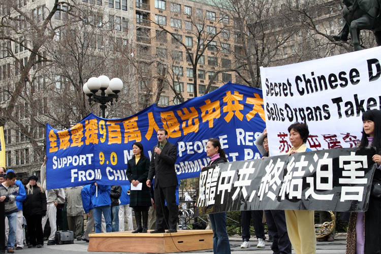 法轮功发言人张而平在集会上揭露了自1999年江泽民和中共相互利用,发动对法轮功的迫害以来,法轮功学员所遭受的种种灭绝性迫害。