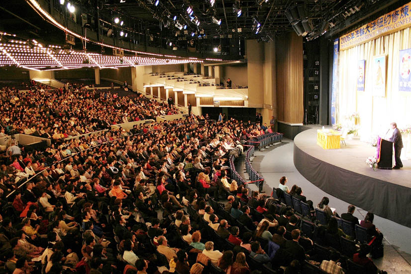 曼哈顿麦迪逊花园剧场是纽约著名的大剧场之一,可容纳5500观众。屋顶上满天繁星散发着柔和的光。蓝底金字的竖幅“慈悲能溶天地春 正念可救世中人”悬挂在主席台的两侧,激励着参加交流会的同修。师父法像和两侧“真善忍”、“法轮常转”的法轮图形庄严的悬挂在主席台上方。数盆丰硕高雅的插花点缀在主席台上,芳香四溢。主席台中间是一个精致的长桌,前方是金色的中英文“真善忍”。台上同修的发言清楚的传到剧场的每一个角落,四千多名大法弟子用心聆听着同修发言。一切显的那么庄严美好。