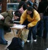 排队签名支持法轮功学员的和平抗议 这位了解了真相的爱尔兰民众自发的帮助学员散发真相材料并向行人讲述苏家屯集中营对法轮功的迫害