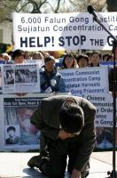 美国人权律师叶宁在集会上,面向被中共迫害致死的法轮功学员王斌的照片跪拜悼念(左上图),表达对法轮功学员深深的敬意。