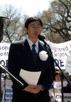 来自纽约的胡志华在集会上呼吁社会各界关注弟弟胡志明的行踪。法轮功学员胡志明2000年被中共非法判刑4年。出狱不到一年, 2005年9月再次被北京公安、国安抄家绑架而失踪,至今已失踪半年,杳无音信。胡志华先生质问中共:“我的弟弟在哪里?”