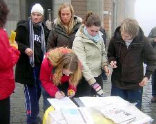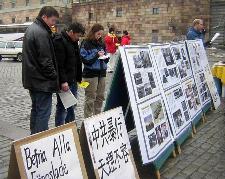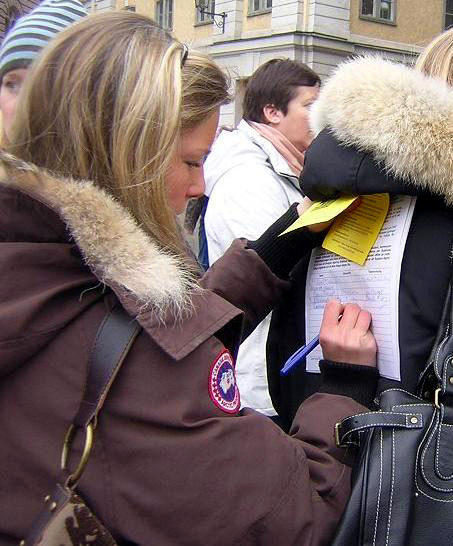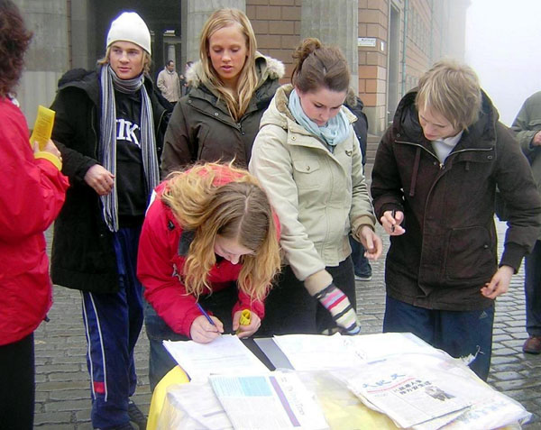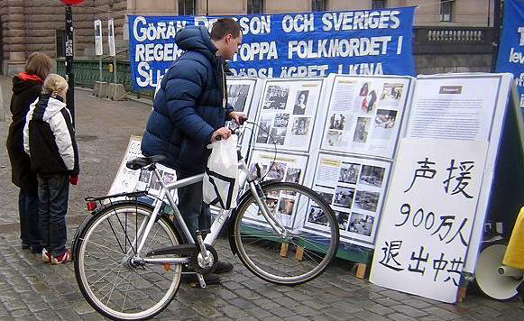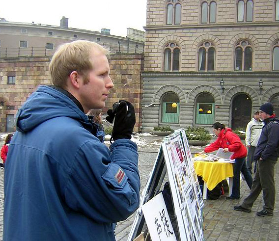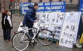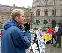 一瑞典小伙子走过来签了名并问发资料的法轮功学员如何才能帮那些在苏家屯受迫害的无辜法轮功学员。学员说,“我们要向世界上每个人揭露中共的罪恶,帮我们把中共的罪恶及退!党!的消息传递给你的同事和亲朋好友,让他们到网站上签名吧。”小伙子点头说“一定,我们每个有良知的人都不能容忍这种事发生。”