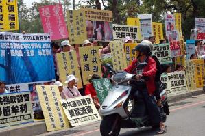 会场外公园旁的走道上,许多参与声援的民众以静坐的方式来表达深沉的哀痛。并通过标语、横幅、展板及传单来揭露中共血腥残暴的事实,告诉路过的民众这一值得大家关注的事实,并呼吁大家一起来制止这场迫害。