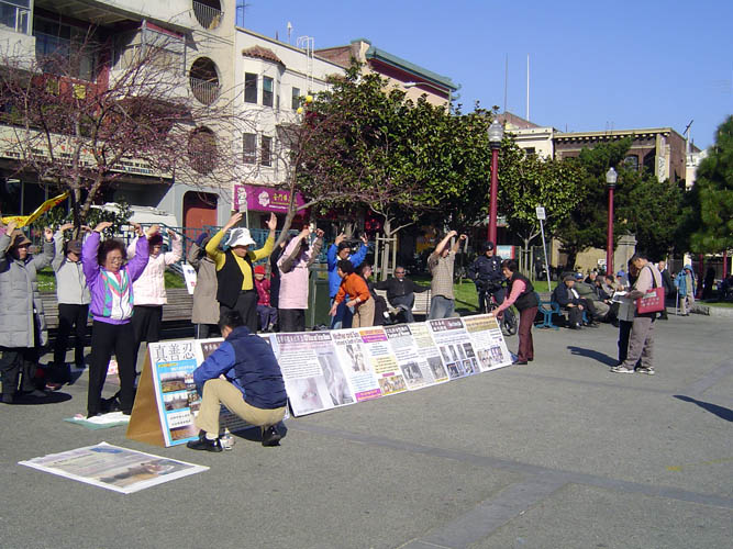 自中共迫害法轮功以来,旧金山的法轮功学员分别在中领馆、市政府广场、中国城花园角炼功讲真相,揭露迫害。