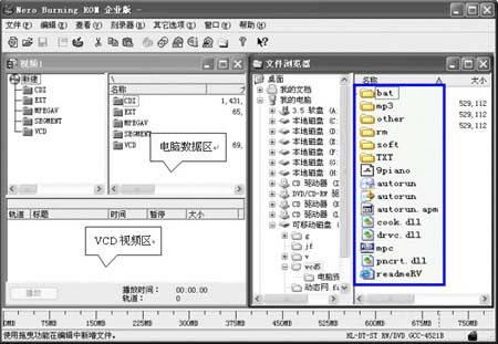 制作方法请参考VCD和电脑两用光盘的制作,简述如下,将完整目录(蓝色方框内)拖到“电脑数据区”,将·九·评*片头等在VCD上看的视频拖入到“VCD视频区”,光盘总容量尽量不要超过650即可。