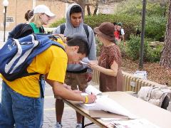 中午时分,主图书馆前过往学生不断,当经过这里的师生看到展出的法轮功学员遭中共迫害、虐杀的图片以及横幅时停下了脚步并了解更多情况。千余份介绍中共苏家屯死亡集中营的传单派发一空,当师生们了解到苏家屯惨案时无不为之震惊和愤怒,纷纷在呼吁美国政府及布什总统对此采取行动的签名表上签名。