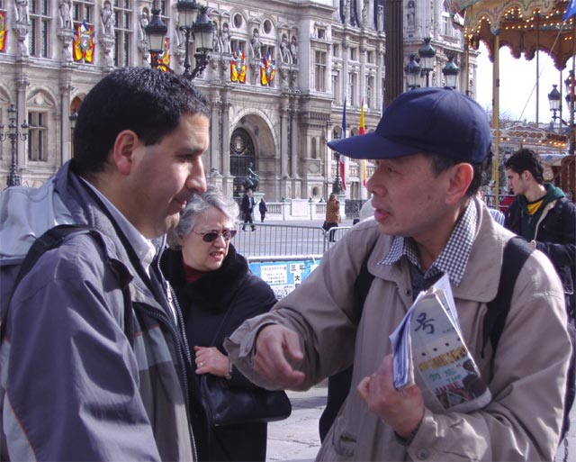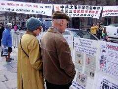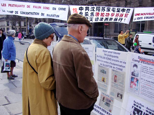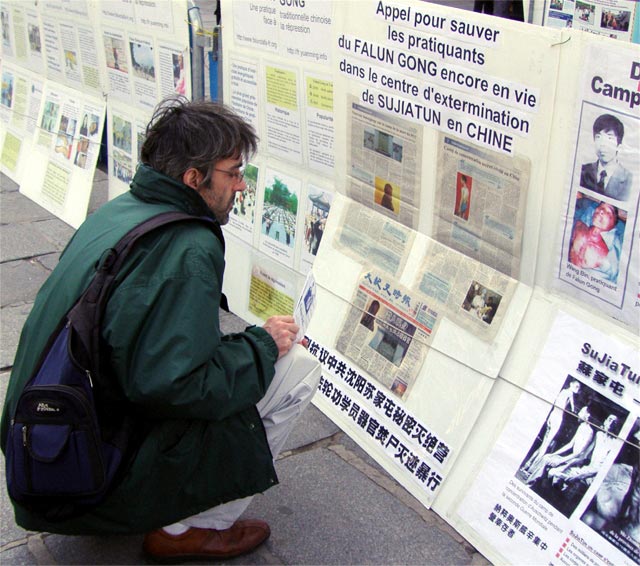 人们驻足聆听揭露迫害的真相和紧急呼吁,观看揭露迫害的真相图片和文字说明。虽然,30日下午一直在下雨,但法轮功学员坚持在雨中把真相传递给人们,呼吁法国媒体、正义善良的法国民众一起营救无辜的法轮功学员。面对现今发生在中国沈阳中共苏家屯集中营的残虐行径,法国民众表达了他们对正义的支持和对罪恶的愤慨。