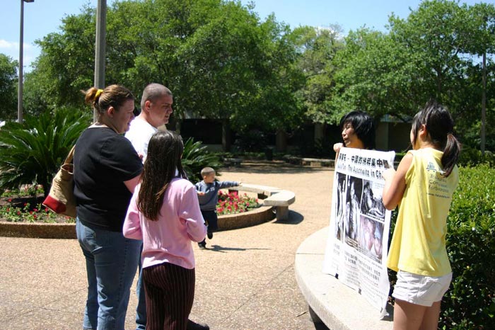一位美国中年男士当看到横幅,听完真相后,开始询问有关器官移植的事情:“在美国与中国在器官移植上有什么不同呢?”在医学中心上班的法轮功学员彭女士告诉他:“在美国等待器官移植的病人需等待几个月或更长,可是在中国等待器官移植仅一周,因为有大量法轮功学员被秘密关押,作为活体摘除之用。”男士听完吃惊不已。他又问道:“中国人愿捐献器官吗?”学员彭女士回答他:“在美国也许有人愿意在死后捐献器官,在中国古老的文化有‘死后入土为安’风俗,可现在中共却在对法轮功学员活体摘除器官。”男士问了很多问题,学员彭女士一一回答。