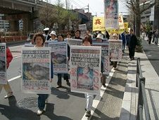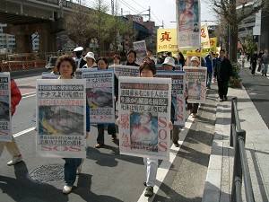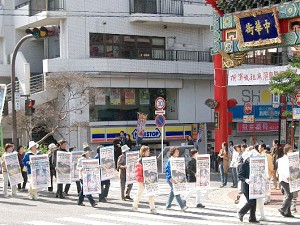 集会后,参加集会的人们还沿着横滨繁华街道、中华街周围、横滨贸易大厦周围举行了近两个小时的游行。沿途散发了大量的传单,将中共设集中营虐杀法轮功学员的残暴罪行告诉世人。