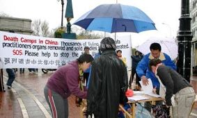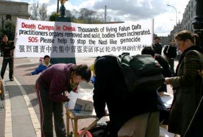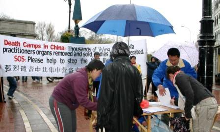 【明慧网2006年4月11日】2006年4月9日,星期日,爱尔兰法轮功学员在首都都柏林著名的步行街——GRAFTON大街举行了呼吁制止中共的征集签名活动。民众和过往的游客看到中共集中营里活体摘除法轮功学员器官的横幅后都感到震惊和愤慨,纷纷到签名桌前了解详情并在给议员的呼吁信上签名。为了方便签名,学员准备了贴好地址的信封,许多民众签名后都表示要自己把抗议中共的信邮寄给议员。一些人还把信和关于苏家屯集中营的报道带给他们的家人,一位女士在签名后还为她的同事带了好多签名信。很多人表示,中共在劳教所和集中营中对法轮功学员的迫害真是太可怕了。学员送给他们英文的《