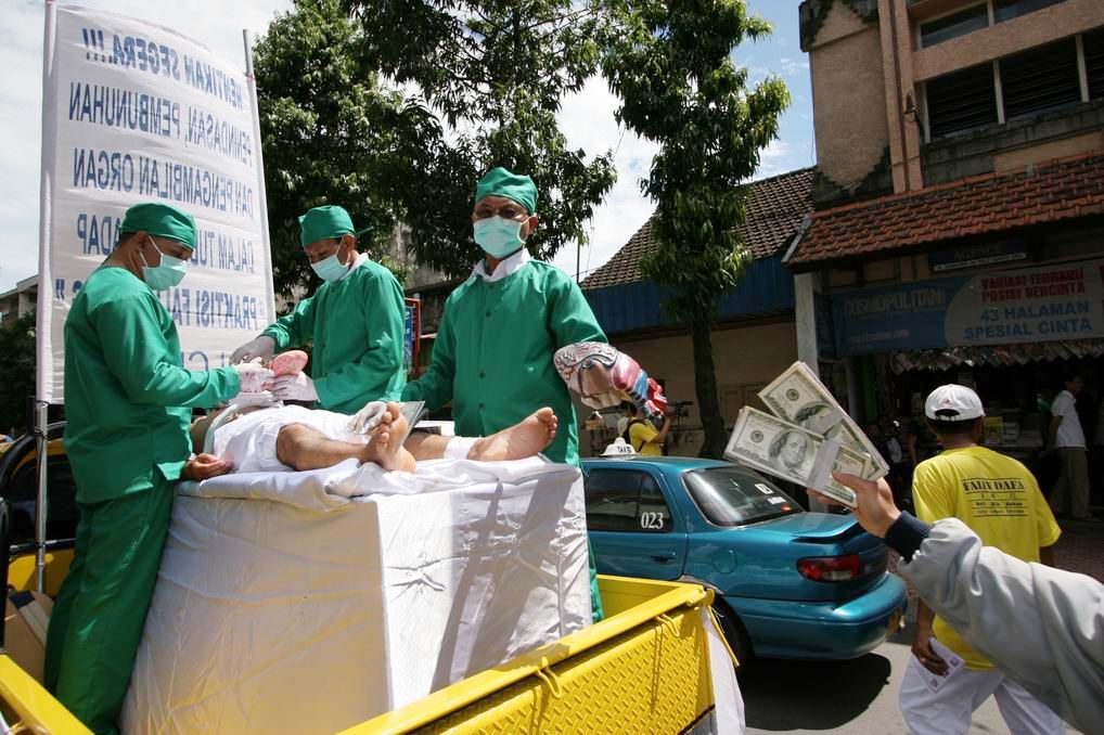 游行中,有真人模拟演示,揭露在大陆的集中营中非法关押并活体摘取法轮功学员器官。游行车上有一群医生,对无辜的法轮功学员进行非法活体摘取器官,把器官贩卖给无知的病患,残酷虐杀无辜赚取美钞。大型横幅写着“中共立即停止迫害、非法活体摘除法轮功学员器官”,悲壮声势立即吸引众多市民的关注,纷纷询问到底是怎么回事?如何帮助制止中共迫害法轮功?他们都说共产主义这样残忍,都不希望它发生在印尼的土地上。
