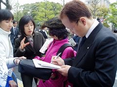 近期,国会前来自各地议员的车辆不断。过往行人当看到被中共残酷迫害的法轮功学员的图片时,不由停下了脚步,主动要传单。其中有一位来自长崎市的日本妇女,惊讶的反复说:“真是太恐怖了,这哪是人的行为,简直是魔鬼。绝对不允许中共对人类生命的蔑视。”随同她一起的男士,诚恳的说:“我一定大力支持你们,并且把这件事告诉给在中国领事馆工作的中国友人。”他们还纷纷签名反迫害,并拿走很多传单。他们表示,要让更多日本同胞了解此事。