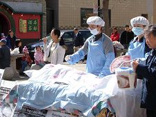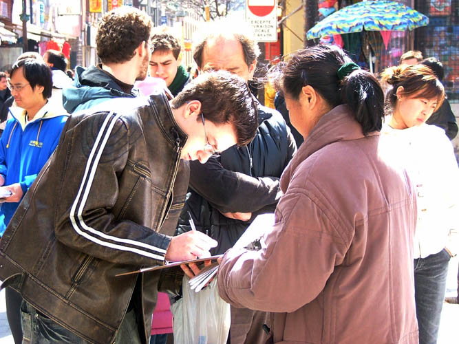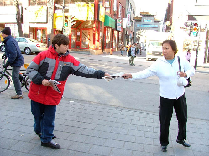 有三个西方男孩大概是随父亲来唐人街吃饭,路过真相展前,父亲催他们快走,他们依然扭头观看,最后被父亲推走。不知何时,三个男孩又返回来签名,并帮助派发资料,尤其是他们特意拿中文报纸,发给中国人。大约三十多分钟后,他们手中的报纸发完了,较大一点的男孩对法轮功学员说:“我可以去吃饭了”。