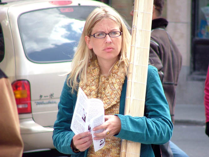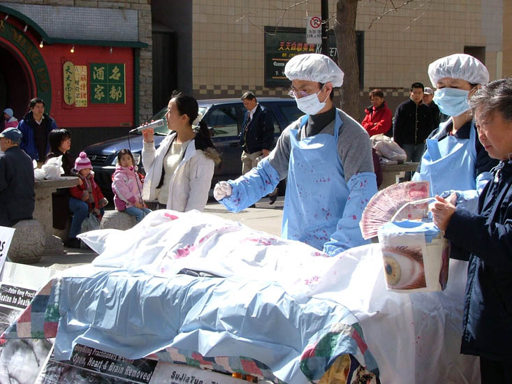 活动的解说者何小姐站在真人模拟演示旁边,用英文、中文不断的向行人讲解在中共统治下的中国大陆正在持续发生着活体摘取、贩卖法轮功学员器官的惊天罪行。她说:“用于器官移植的脏器不是在尸体上摘的,而是在活人身上摘取的,仅仅在苏家屯,就曾经有6000多名法轮功学员被作为活体器官库关押着。”