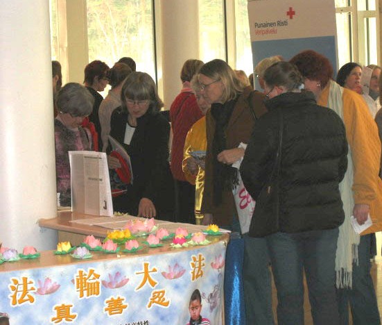 活动中,学员带来的纸折莲花引起人们极大兴趣,学员们热情的分送,同时向人们讲述小法度的爸爸因修炼法轮功在中国大陆被迫害致死,之后在澳洲的妈妈带着小法度走遍了世界上几十个国家讲真相,她们呼唤世人的良知善念,共同制止中共迫害法轮功,同时希望借用美丽的莲花把法轮大法的美好带给天下人,为此小法度和妈妈曾三次来过芬兰。