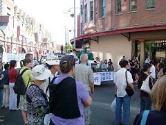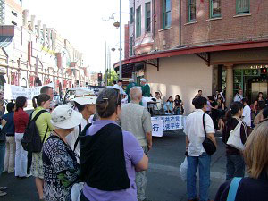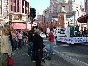 集会后,人们在警车的开道下举行封路游行,游行队伍分为反迫害、鼓阵、·九·评*、退!党!及大.纪.元;旗阵五个方阵,从贝尔莫公园游行穿过市中心至唐人街。众多的标语,威武旗阵、鼓队和一路的口号声使近1千万有志人士退出中共及其所有体系的消息快速传播至街头两边的民众。游行终点处,还现场表演了一个短剧,揭露中共集中营活体摘除法轮功学员器官出售的血腥事实,中共集中营、各大劳教所迫害法轮功学员的灭绝人性的恶行令观众和路人皆震惊不已。
