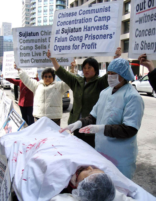 ![]() 学员在比尔•格雷厄姆的选区办公室门前通过演示活体摘除器官讲真相。 |