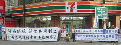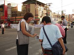 法轮功学员于路边陈情,并让乡民了解中共虐杀及活体摘取法轮功学员器官的暴行 法轮功学员向路人发材料,说明大陆劳教所关押学员,活体摘除器官盗卖,并焚尸灭迹。 |  法轮功学员向陈总统陈情中共盗卖法轮功学员的器官 |