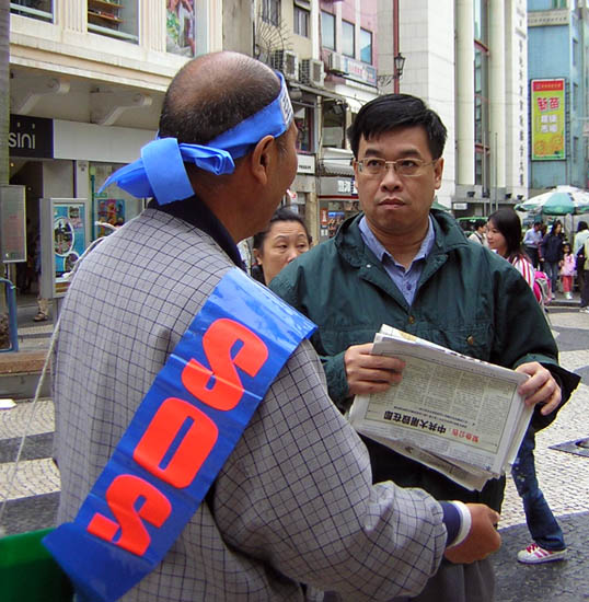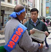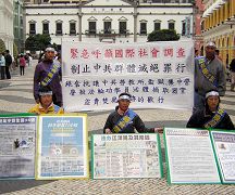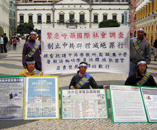 15日适逢复活节假期,大批大陆和世界各地来的游客经过学员们展示的图片和拉出的横幅前,纷纷止足观看,大陆来的游客拿出相机拍下这个在大陆看不到的场面。澳门立法局议员吴先生也前来了解情况。