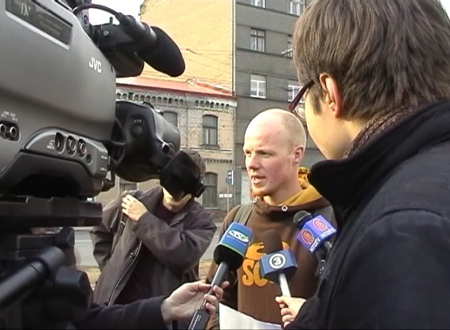 【明慧网2006年4月16日】为了抗议中共对法轮功学员活体摘取器官的法西斯罪行,2006年4月14日,拉脱维亚法轮功学员在中共驻里加使馆前开始72小时的抗议,今年都灵冬奥会上为拉脱维亚夺得历史上首枚奖牌的雪橇运动员卢比尼斯也参加了活动。