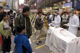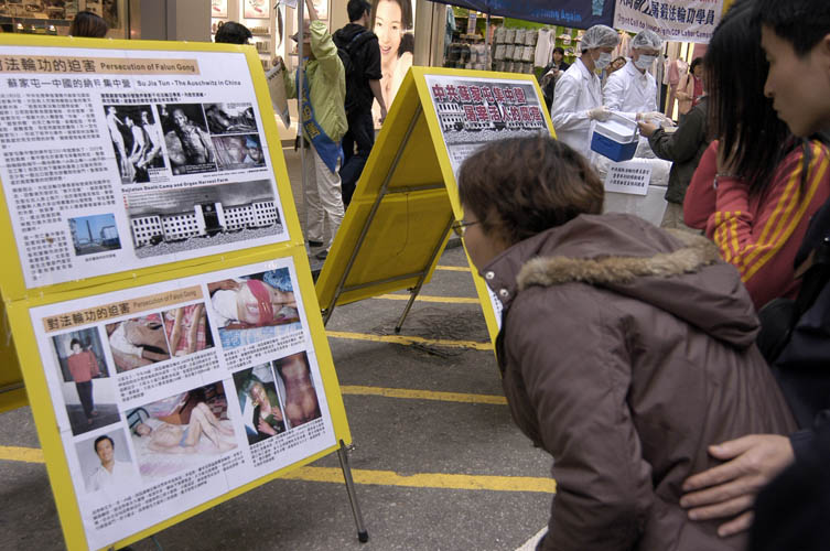 法轮功真相的资料站,展示有关的图片、派发资料,并以真人模拟的方式曝光中共劳教所活体摘取及盗卖法轮功学员器官的血腥罪行。揭露出来的迫害真相引起很多市民及游客的关注。