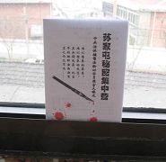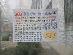 ![]() 张贴在龙潭公园公告栏里不干胶《曝光秘密集中营》 | ![]() 张贴在龙潭公园公告栏里的不干胶《SOS 紧急呼吁 停止虐杀》 |