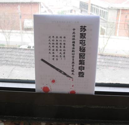 ![]() 贴在半坡街社区公告栏中的《·九·评*》宣传画和不干胶“SOS紧急呼吁 停止虐杀” |