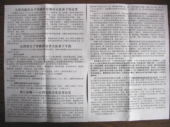 ![]() 放在人代会会场的真相传单《太原市新店女子劳教所近期对大法弟子的迫害》、《山西省女子劳教所迫害大法弟子手段》、《惊心动魄――山西法轮功受迫害纪实》 |