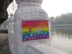 ![]() 城西水系路边悬挂的条幅“法轮大法好” | ![]() 贴在城西水系墙上的各种真相不干胶 |