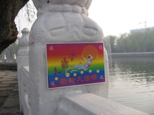 我们把一张漂亮的“法轮大法好”卡片紧紧的贴在护栏上,正在拍照,吸引了游人的目光。